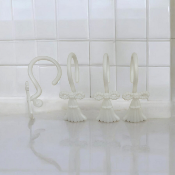 12 Gancho para cortina color blanco, vienen con 4 diseños diferentes.